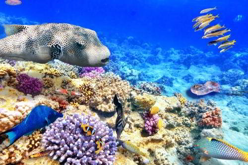 Гигантская океаническая экосистема Большого Барьерного Рифа является домом для огромного количества живых организмов. Здесь встречается около 1500 видов рыб, 500 из которых исключительно рифовые. Многие виды моллюсков, крабов, креветок населяют рифы и мелководье. Морские ежи, звезды и гребешки, кальмары и омары, осьминоги и лангусты в огромном количестве водятся в теплых водах рифа. Сюда приплывают несколько видов китов, а киты-горбачи традиционно проводят в водах рифа с июня по август период размножения. Аналогично китам, морские черепахи производят потомство в южных водах рифа. В большом количестве здесь водятся дельфины, касатки и тигровые акулы. На коралловых островах гнездятся колонии морских птиц, в том числе редкие – белобрюхий орлан и розовая крачка. А вот флора на островах не такая разнообразная, встречается все около 40 видов растений.