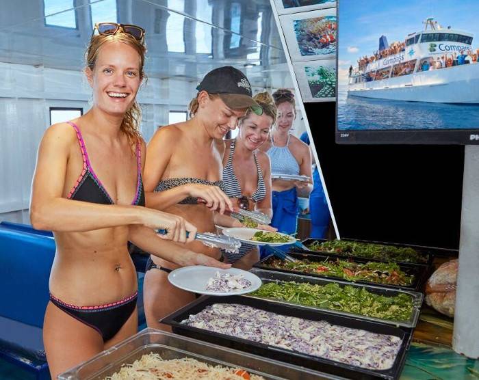 В обеденное время гостям предложат барбекю со свежими салатами. Чай и кофе доступны во время стоянок судна. На обратном пути в Кернс будут предложены закуски, сыр, фрукты и бокал вина.