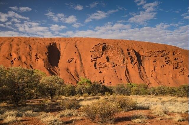 Австралия совсем не знаменита высокими вершинами и не является популярной у альпинистов, тем не менее горы в Австралии есть, и горы эти очень необычные. Если спросить коренного австралийца, какая гора является символом Центральной Австралии, то он наверняка скажет – Улуру или Красная гора. Огромное скальное образование, возникшее около 680 млн лет назад на дне древнего озера Амадиус, разрушаемое ветрами и резкими перепадами температуры, возвышается в центре пустыни, нарушая однообразный пейзаж. До того, как в 1873 году европейские ученые нашли, описали и дали свое название – Айерс-Рок, эта красная гора в Австралии была домом для многих племен. 10 тыс. лет назад населяющие эти земли аборигены жили в пещерах, изрезавших подножие горы. Они почитали гору как колыбель жизни, источник воды, бьющий из скалы, давал столь необходимую для выживания влагу. До наших дней на стенах скал сохранилось множество рисунков, созданных руками древних людей, изображающих почитаемые аборигенами божества, историю создания Красной Горы Улуру и сюжеты их жизни.