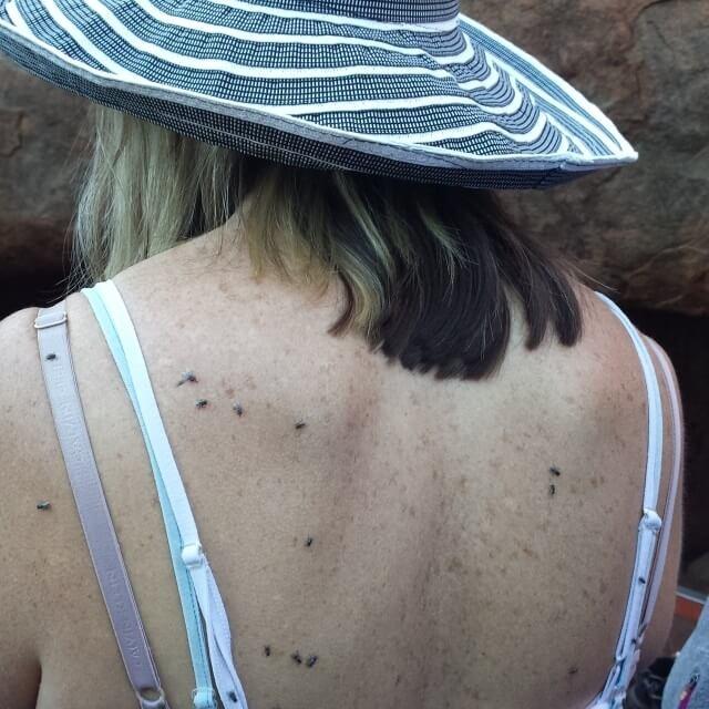 Во время путешествия по Австралии избежать встречи с мухами не удастся. Мухи в Австралии везде. Но не стоит серьезно беспокоиться, они не кусаются и для человека вполне безобидные. В основном, жителям докучают фруктовые мухи (fruitfly), которые питаются пыльцой растений или мякотью и соком фруктов. Эти мелкие черные создания летают вокруг, садятся на кожу и одежду и норовят залезть в глаза и рот. В магазинах продается огромное разнообразие всевозможных средств для защиты и отпугивания – кремы, спреи и аэрозоли. Замечено, что мухи не любят прохладную кожу, пудру и белый цвет. Поэтому очень рекомендуется надевать светлую одежду и не загорать до черноты. В городах мух практически нет, а вот в пригородах, особенно на фермерских хозяйствах встречаются в больших количествах.