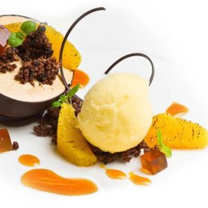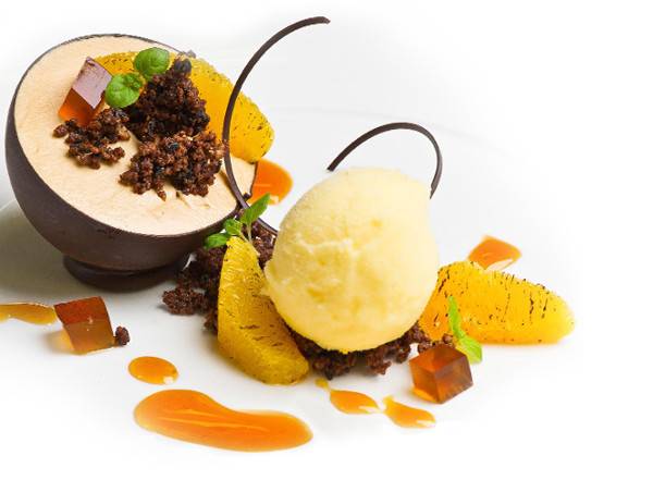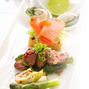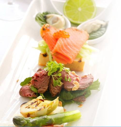 Пряный лосось в сливочном соусе/Краб с сальсой из авокадо/Вырезка говядины с соусом из трюфелей/Карамелизированный инжир