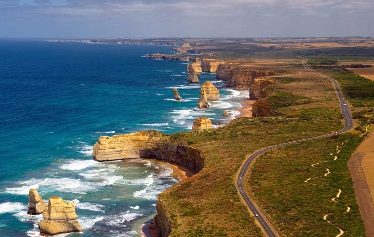 В конце дороги путешественников ждет незабываемое зрелище. Ради возможности увидеть это чудо природы сюда, к берегам Южного океана, ежегодно прилетают и приезжают многие тысячи туристов. Вдоль берега из воды вздымаются величественные скалы, получившие название 12 Апостолов. Возраст морских гигантов ученые оценивают в 20 млн лет. Эти известняковые образования меняют цвет в зависимости от интенсивности солнечного освещения, поэтому интересно наблюдать их на рассвете или на закате, когда солнце меняет яркость своего освещения. Чтобы оценить масштаб и красоту побережья и увидеть уходящее вдаль дорожное полотно, туристам предлагают совершить полет на вертолете над скалами.